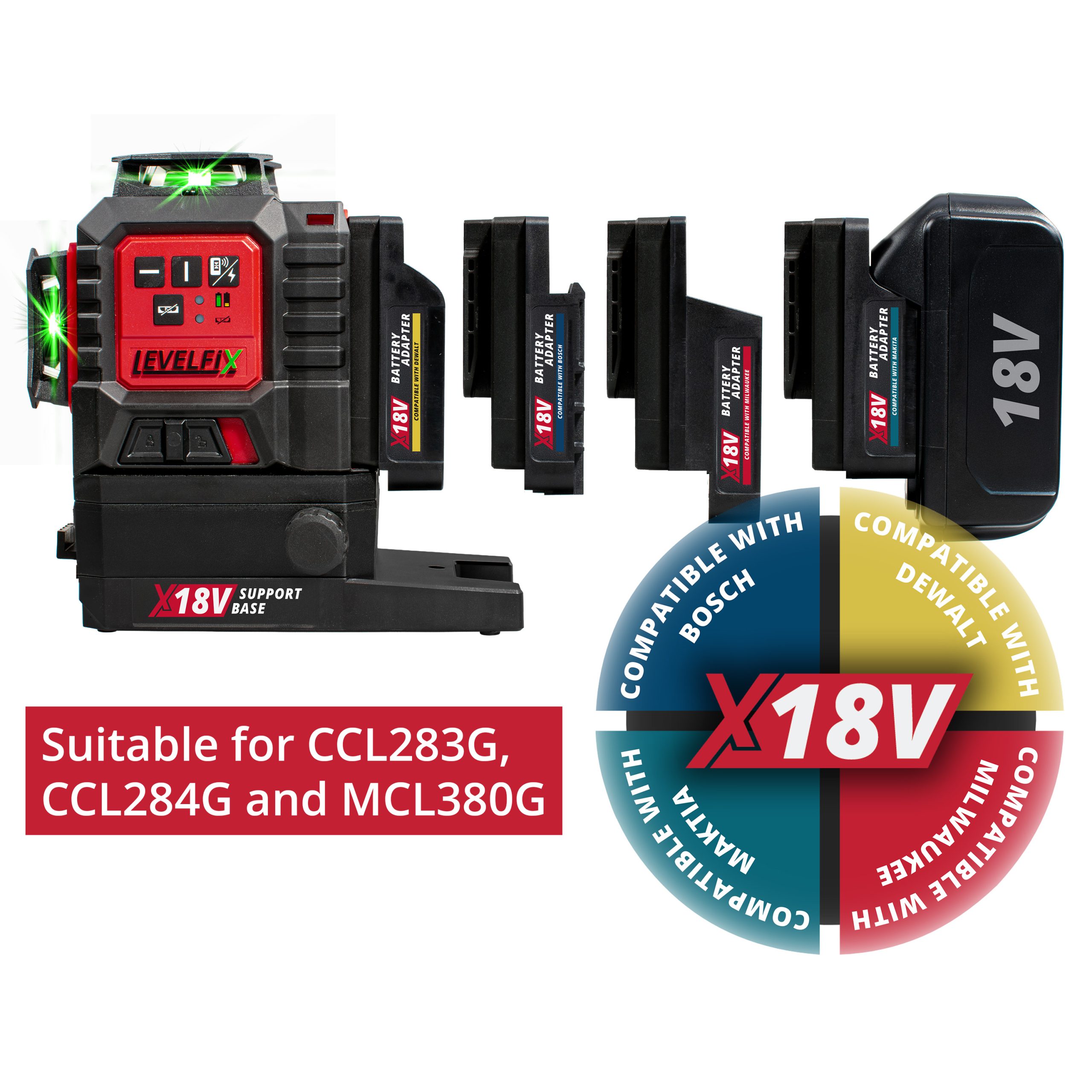 De CCL284G is nu ook te gebruiken met de 18V accu’s van DEWALT, Makita, Bosch en Milwaukee met behulp van de LEVELFIX X18V Smart Battery Adapter. Deze adapters zijn los verkrijgbaar. (Art.nrs: DEWALT 554260, Makita 554261, Bosch 554262 en Milwaukee 554263)