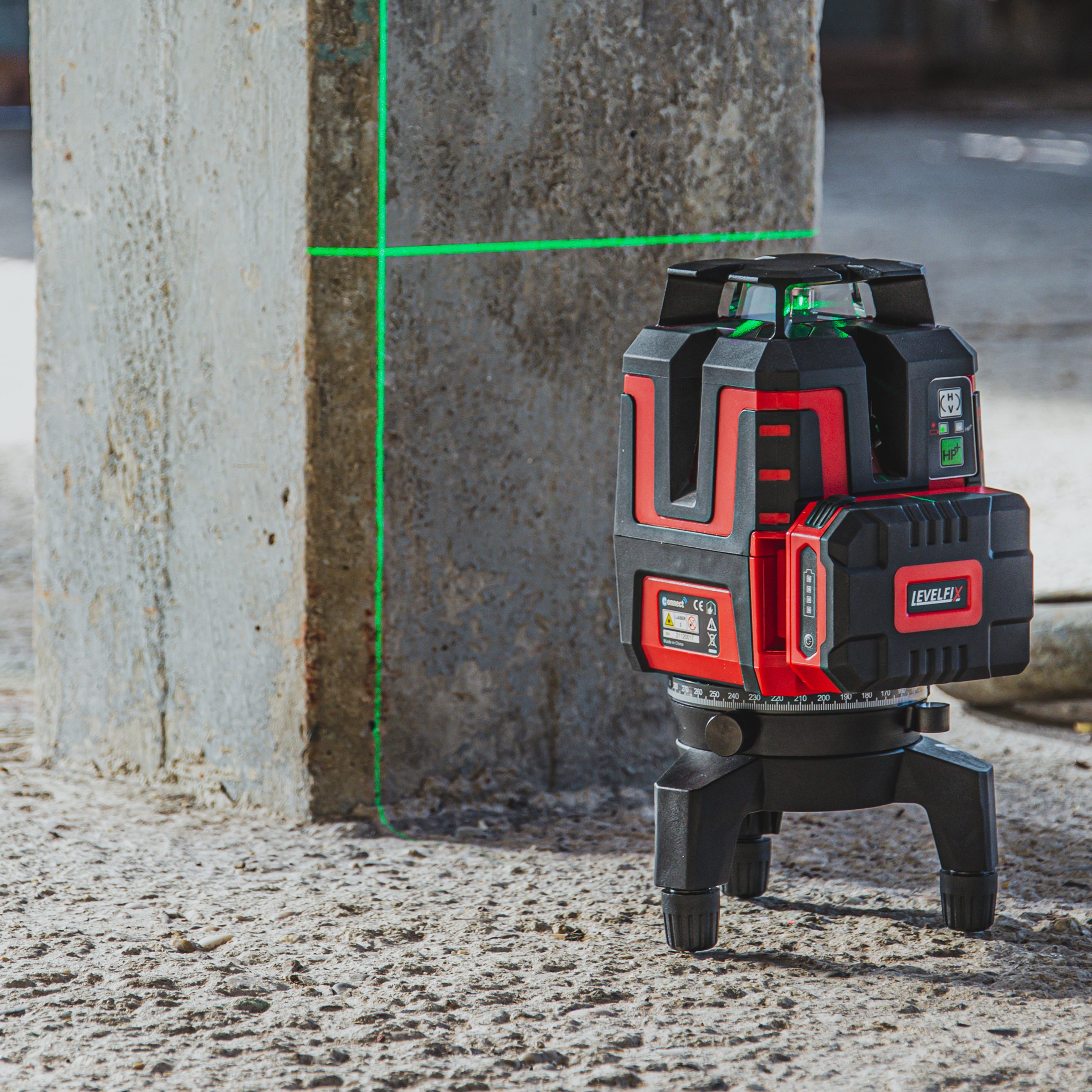 De LEVELFIX CCL680G is een multi lijnlaser met fijninstelling en projecteert een groene 360° horizontale lijn, 4 verticale lijnen onder 90° en een oploodpunt.