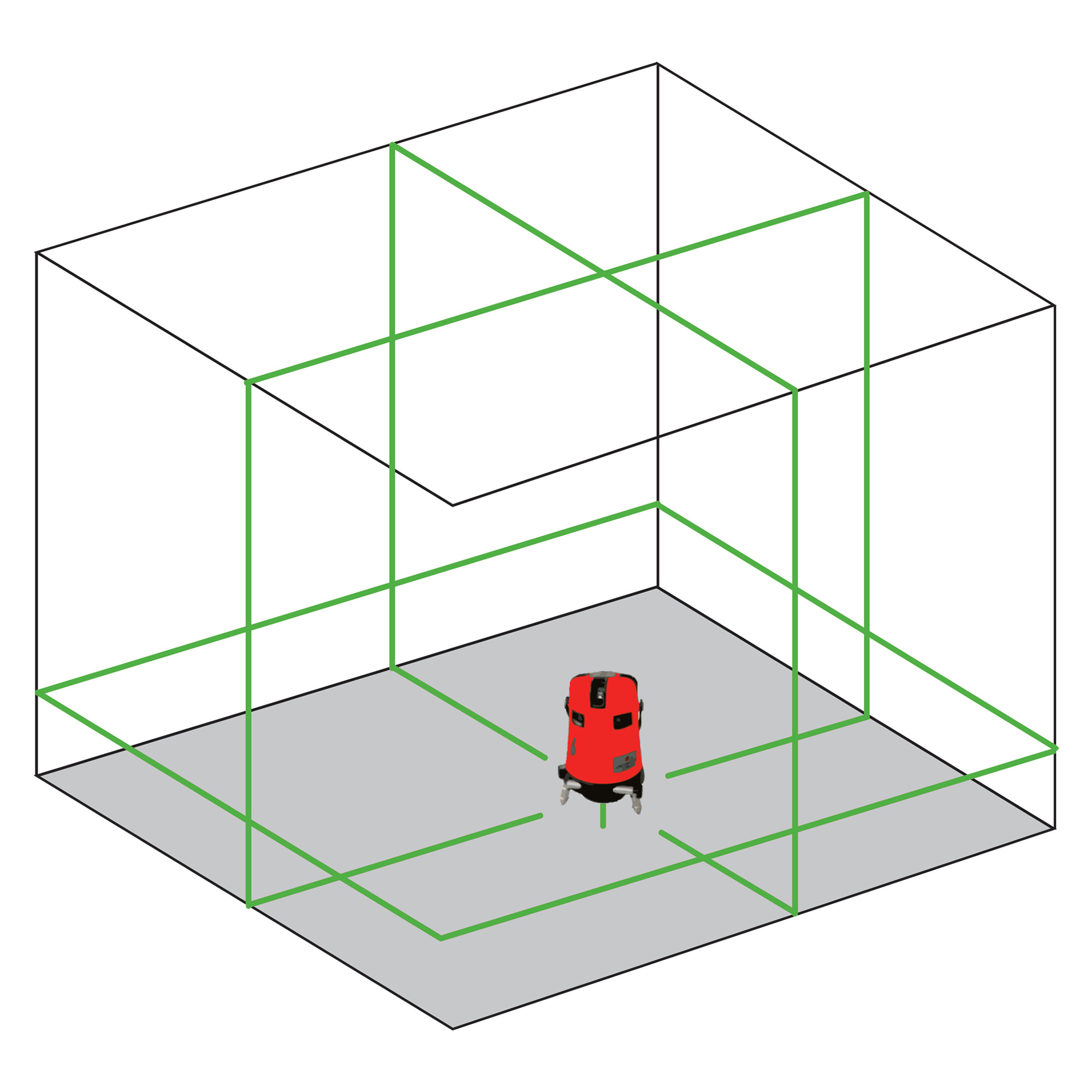 Servo multilijnlaser met fijninstelling, groene 360º lijn, 4 verticale lijnen onder 90º en oploodpunt.